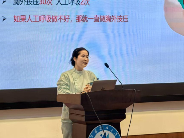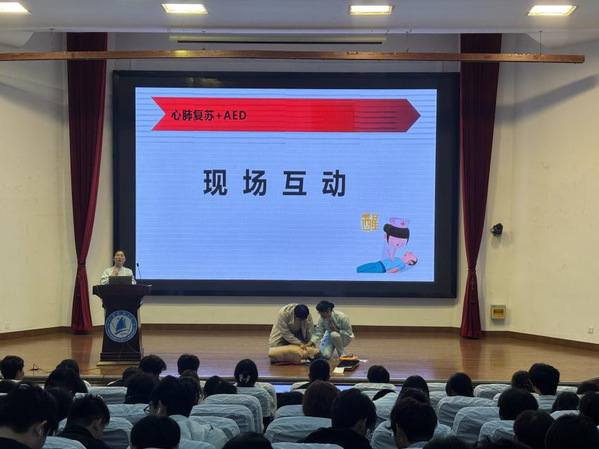 张剑影护士长是副主任护师、江苏省急诊急救护理专科护士,同时担任镇江市急诊急救护理专业委员会委员,拥有丰富的急诊急救临床经验与教学经验。讲座伊始,她以“时间就是生命”为核心,结合真实案例切入——对比不同场景下心跳骤停患者因急救是否及时导致的不同结局,直观展现了心肺复苏(CPR)与自动体外除颤器(AED)使用的重要性,强调心脏骤停“黄金4-6分钟”内施救的关键意义,引发在场学生对急救知识的重视。