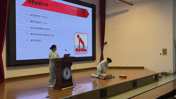 最受期待的现场互动环节中,2名同学主动上台,在张护士长与医护人员的指导下尝试心肺复苏操作。医护团队手把手纠正按压位置、调整按压力度,耐心讲解“如何避免过度通气”“按压中断时间尽量缩短”等易错点,让学生在亲身体验中掌握操作要领。上台演示的同学表示:“以前只在视频里见过急救操作,这次亲手实践才知道细节有多重要,以后遇到紧急情况,也能更有底气伸手帮忙。”