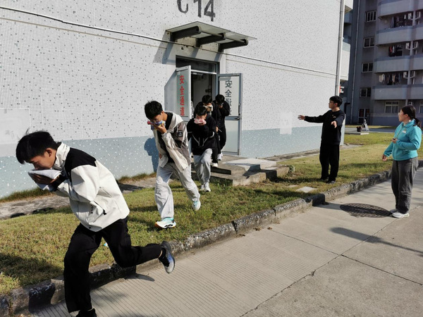 在C14 楼栋,楼栋主管周书伦、赵会平与李阿春老师协同配合,有序指挥学生开展消防紧急疏散演练,同学们按照消防逃生规范,用毛巾、口罩等捂住口鼻,低姿快速从安全通道撤离,整个过程紧张有序。