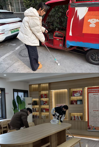 宣讲结束后,实践团即刻转入社区环境清理工作。15名成员分为2组,对社区服务中心室内外区域展开全面清扫:一组手持扫帚、拖把,仔细清理大厅、走廊的地面灰尘和角落杂物,不放过桌椅下方、墙角等卫生死角;二组携带分类垃圾袋,捡拾社区内的纸屑、塑料瓶等垃圾,对垃圾分类打包。成员们分工明确、配合默契,弯腰清扫、俯身捡拾,即便手指被寒风冻得发红,仍坚持将每个区域清理干净。经过近一小时的奋战,社区服务中心内外环境焕然一新,为居民营造了干净整洁的活动环境。