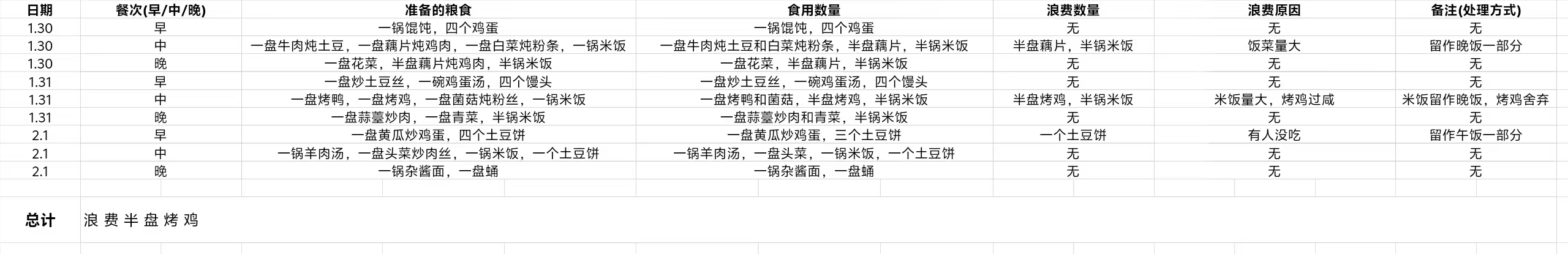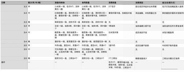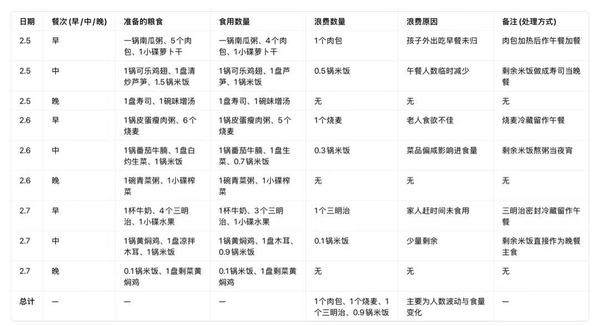 调研过程中,团队成员深入各自家庭内部,覆盖城市、乡镇、农村等不同区域,共统计五个家庭的粮食浪费情况。通过数据统计与分析发现,家庭粮食浪费主要集中在食材采购过量、烹饪分量不当、剩余饭菜处置不合理等方面,部分家庭因对粮食价值认知不足、碍于情面过度点餐等原因,浪费现象较为突出。为了解决这一问题,成员自发进行节约粮食每日打卡任务,带动身边更多人参与到“光盘行动”中来。