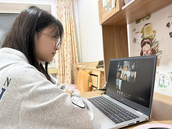 图为团队成员郭妍莹参加线上交谈会的场景