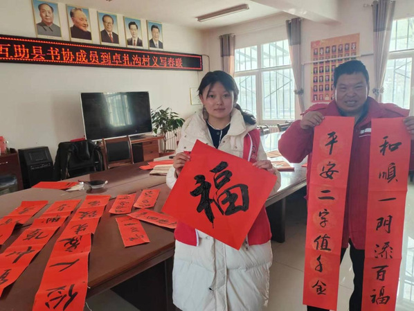 图为实践团成员王正芳参与义写春联活动