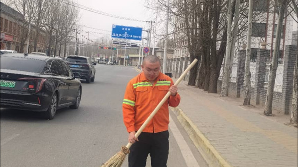 图为实践团成员陈海晓在清扫街道