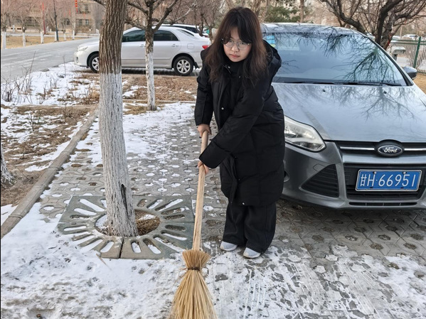 图为实践团成员马思甜在清扫积雪