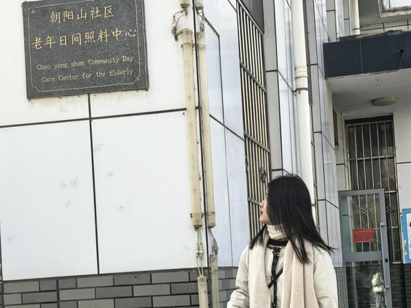 图为实践团成员李亚萍在社区中心前