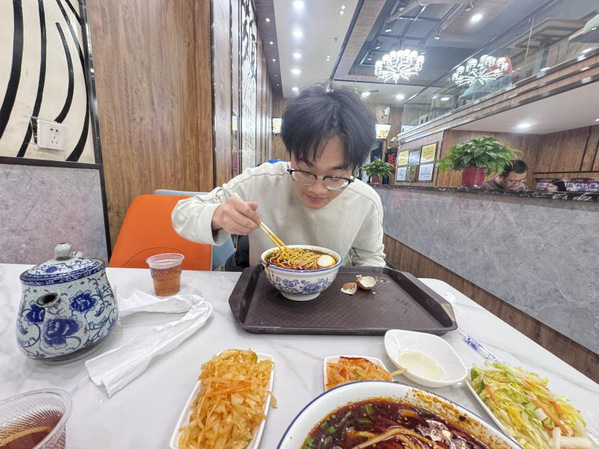 图为黄家徽在兰州老字号面馆品尝拉面