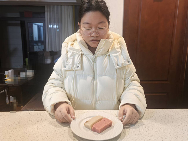 图为单朱悦品尝苏州特色美食板油糕