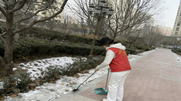 张莹莹队员的家乡近期气温较低,社区道路、广场上仍有积雪和结冰,给居民出行带来不便,该队员主动拿起铁锹、扫帚、推雪板等工具,投入到扫雪除冰行动中。不畏严寒、齐心协力,将社区主干道、文化广场、出入口等处的积雪彻底清理干净,消除了安全隐患,保障了居民出行安全。