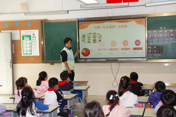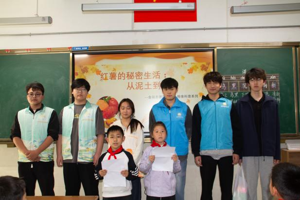 活动伊始,志愿者以生动有趣的语言开启科普课堂,围绕红薯的前世今生、成长日记、从田间到餐桌、爱粮节粮我践行四大板块展开讲解。志愿者借助精心制作的PPT,用通俗易懂的方式向孩子们介绍红薯原产美洲、明代传入中国的历史,讲述徐光启推广甘薯救荒的故事,让大家了解红薯从“救命粮”到“健康餐”的时代变迁。课堂上,志愿者详细介绍蜜薯、紫薯、白薯的品种特点,讲解红薯从育苗、栽种、田间管理到收获的完整生长周期,普及“糖化回甜”“起垄种植”等趣味农业知识,让孩子们直观感受一颗红薯从泥土中生根发芽、茁壮成长的全过程。