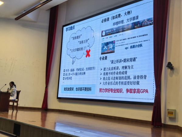 在学业规划方面,学长学姐建议新生从大一开始就夯实专业基础,努力提升GPA,为未来保研、出国、评奖评优奠定坚实基础。分享内容还涵盖了不同年级的课程特点,提醒同学们合理规划学习进程,同时重视心理健康与公共课程学习。他们鼓励大家,即使暂时没有明确目标,也要保持良好学业状态,尽量避免挂科。