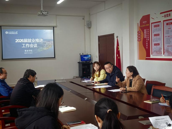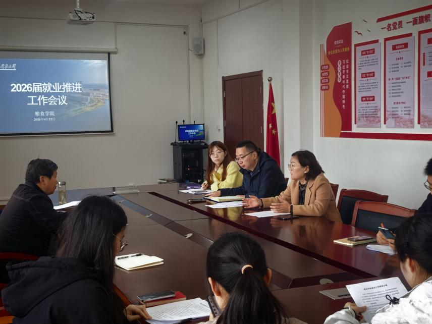昨日,粮食学院召开2026届毕业班就业工作推进会议。学院院长鲁玉杰、党总支副书记喻永光、就业辅导员武兆文、22级毕业班辅导员李阿春,以及各系部主任、各班级班主任出席会议,共商就业推进举措。
